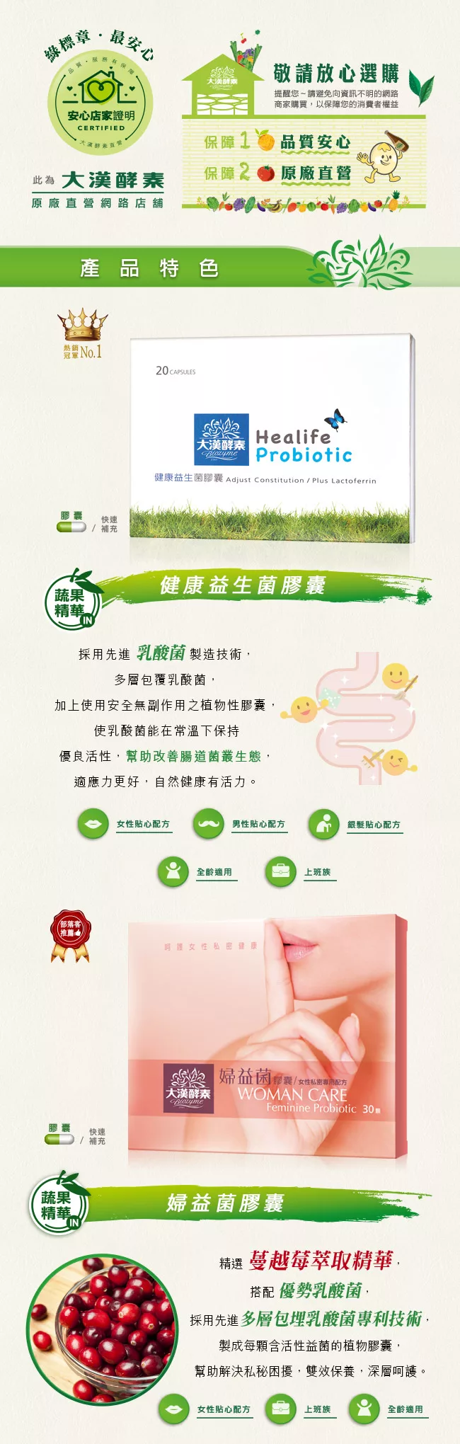 【大漢酵素】健康益生菌膠囊(20顆-盒)+婦益菌膠囊(30顆-盒)